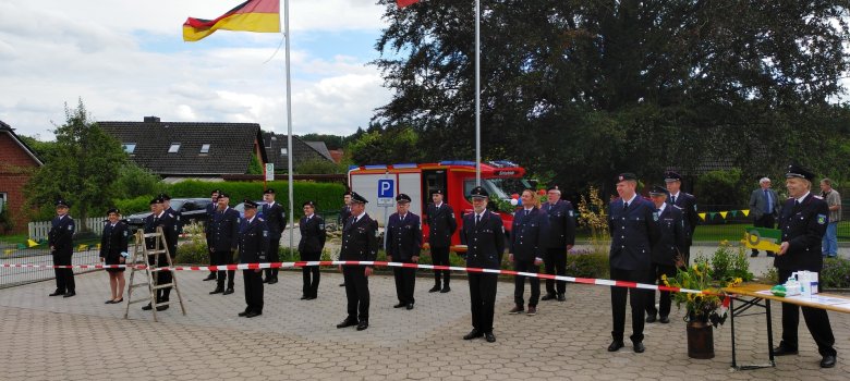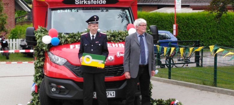 Eröffnet wurde das Fest mit der feierlichen Übergabe des neuen Fahrzeugs und der Einweihung des neuen Feuerwehrhauses durch den Bürgermeister Gerhard Peters, der in seiner beeindruckenden Rede allen dankte, die mitgeholfen haben, das neue Feuerwehrhaus zu errichten, mit Eigenleistung, Baubewachung und ein besonderer Dank galt auch den fleißigen Leuten, meist den Frauen, die während der Zeit für das leibliche Wohl der unermüdlichen Helfer*innen sorgte. Besonders dankte er dem stellvertretenden Wehrführer Dirk Frömel und seiner Lebensgefährtin Charline Schubring, die ihren Partner für eine so lange Zeit entbehrte. Sie bekamen feierlich einen Baum für ihren Garten überreicht. Dem Wehrführer Andras Stamer-Loß, der sich in seiner Rede seinerseits bei der Gemeinde, der Feuerwehr und allen Sirksfeldern*innen bedankte und seine Freude über dieses gelungene Unterfangen ausdrückte, wurde dann symbolisch (mit einem Bild auf Leinwand in den Sirksfelder Wappenfarben) der Schlüssel für das Fahrzeug überreicht, mit dem Dank für die Organisation, die Auswahl und die Überführung. Der Höhepunkt der Rede war gegen Ende dann der herzliche Wunsch an die Feuerwehrkameraden und -kameradinnen, bei ihrer wertvollen freiwilligen Arbeit möge immer alles gut verlaufen (retten, löschen, bergen, schützen) und alle mögen aus ihren Einsätzen immer heil, gesund und unversehrt wieder zurückkommen.
